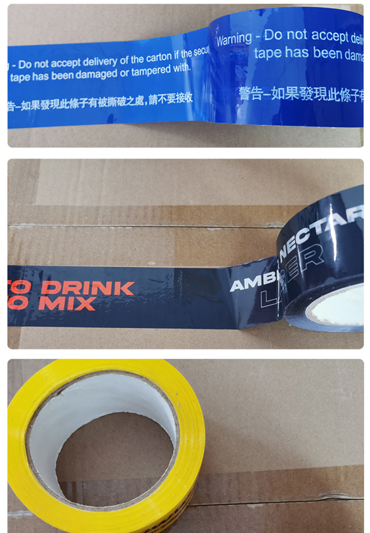 Material: BOPP film with strong adhesive. Features: pressure sensitive, nontoxic, flavorless, Environmental friendly and low cost, applicable to all kinds of carton sealing. Color: transparent with 1 color, can be customized according to customers’ request. Specification: normal width: 24mm, 50mm Length: 80-350 yard (1 yard=0.9144 meter) |